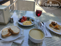Алкоголь. Бар работает целый день без продыха. Я поклонник красного сухого вина, пила только его. Бутылки иногда открывали при мне новые, вкус такой же, ничего не разбавляют. Ракы, пиво, коктейли делают целый день. Люди за столиками у бара сидят целый день. В 15 часов бранч - очень неполезное питание! картошка фри, куриные штучки в панировке (не ем, не знаю как называются), а , нагетсы, кетчуп и тд.