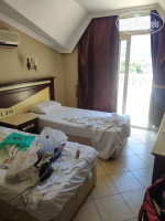 Отдыхала от интуриста. Приезд был поздний, заселили сразу, в основной корпус, сумку занесли в номер. Номер 401, на самом верхнем этаже. Вид на горы. Это хорошо, а то во дворе отеля звучит музыка и стоит детский ор у бассейна. Две кровати, белоснежное бельё, полотенца, балкон со столиком и стульями, телек с одним русским каналом россия 24, маленький холодильник, полы керамогранит, кондиционер (утром сломался, но в этот же день до обеда быстро починили - спасибо отельному гиду, она мгновенно на первой же утренней встрече уладила все мои вопросы на ресепшн, где никто не говорит по- русски). В ходу инглиш! С персоналом я очень легко находила язык. Из минусов в номере: нет крючка в туалете для полотенца, нет стаканчиков для зубных щеток (но я потом принесла из бара), на крыше какие-то устройства технические типа солнечных батарей и прочего - гремят, и с этим ничего не поделаешь, только привыкать! Уборка номера была, полотенца поменяли один раз, мусорное ведро ежедневно очищали, туалетная бумага без проблем, мыло, флакончики с шампунем и гелем для душа.