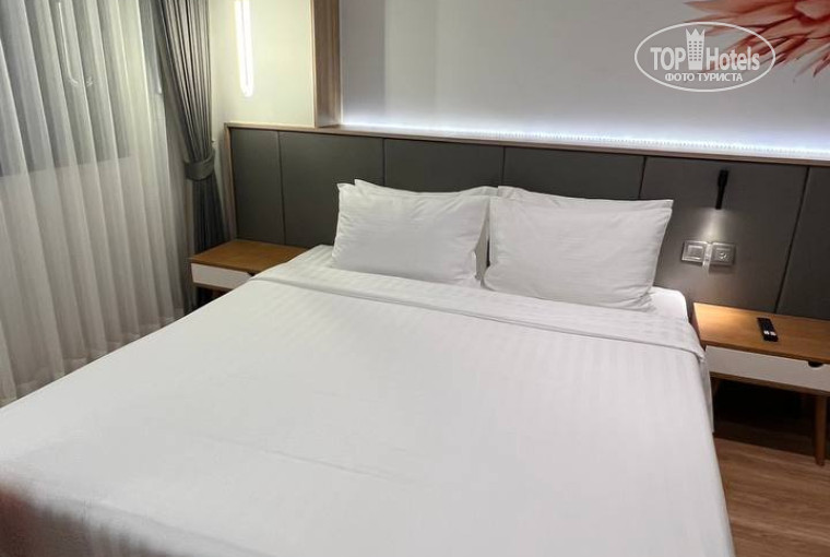 Матрас немного жесткий, но привыкаешь. Комфортно. Мягкие подушки. Шторы блек аут.