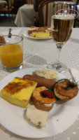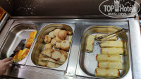 Разнообразие закусок, и не просто что-то быстро порезано, а какие-то разнообразные тарталетки, профитроли с разными начинками, канапе, рулетики. Горячее: каша, сосиски, запеканки, картошка, сырники, блинчики, омлет (что-то менялось каждый день). Сыры из собственной сыроварни, которые можно приобрести с собой. Холодец, салатики, колбасная нарезка, маринованные овощи.