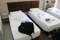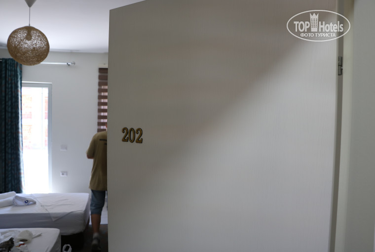 Итак наша комната 202 оказалась на третьем этаже. Номер большой, просторный, светлый и совсем свежий. Номер очень понравился. В комнате было три односпальные кровати, прикроватные тумбочки, небольшой ЖК телевизор, холодильник, кондиционер, платяной шкаф. Также был и балкон с видом на строящиеся напротив здания.