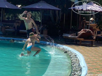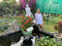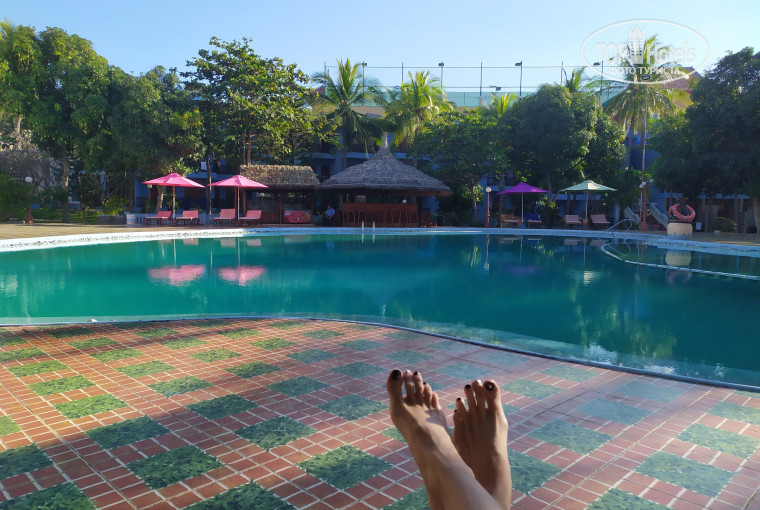 Отдыхали перед самым Новым годом. Заселили сначала в домик на первом этаже, он нас не устроил, и нам предложили за доплату в 100$ другой номер в корпусе, мы согласились. Он с балконом, большая кровать, диванчик, вид с балкона на море. Бассейн чистый, хороший, лежаки всегда были. Завтраки скромные, но голодными не оставались. Пляж рядом, и там лежаки под грибочками стоят, мы рано утром ходили и вечером, места всегда находили себе. На обед и ужин ходили в разные кафе, в мадам Дин понравилась еда, часто ездили на боке (гребешки, креветки, рыба) все свежее, и очень вкусное!