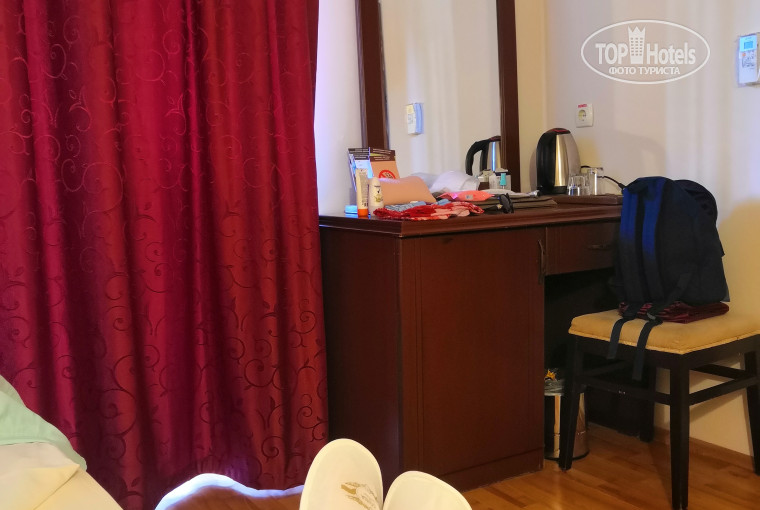 Мой номер был без балкона, но очень уютный, в номере было очень чисто не смотря на не новую мебель)) первые дни из за дождя не шли русские каналы, потом все восстановилось. В номере был просторный шкаф в коридоре, в котором было 6 вешалок, тапочки. На стене большое зеркало)