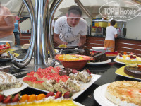 Еды было много и разнообразно, но почти все время одно и тоже и не сказать, чтобы очень вкусно. За мясом очередь. Частенько оно напоминало подошву. Проблемы у них там с мясом. Всегда была естественно курица в разных видах, рыба, бывали всякие колбаски, шницели, ракушки, отдельный стол с приготавливаемой пастой. Супы пару видов, в основном пюре, а если не пюре то просто бульон с горохом или фасолью. Выпечки всякой много и вкусно. Салатов тоже немерено. Помидоры, огурцы были в достатке. Фрукты довольно вкусные: бананы, арбузы, апельсины, мандарины, инжир и еще какая-то хрень ненашенская. На обеде можно было заказывать из бара что-то: пиво там, вино (красное и белое), воду. Можно было и платный импортный алкоголь заказывать с отдельной тележки.