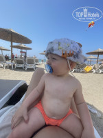 Пляж. Лежаков много, всегда можно найти свободный. Даже при том количестве туристов, как сейчас. Песок только там, где лежаки. На входе в море и дно - довольно крупная галька. Причем, дно - крупные камни. За неделю, что мы тут - спокойного моря не было ни разу (ни утром, ни вечером). Все время небольшая волна и из-за этого вода мутная. Входить и входить одной с малышом - целая проблема. Отель полный, а пляж небольшой - поэтому в море все плечом к плечу, не каждому понравится.