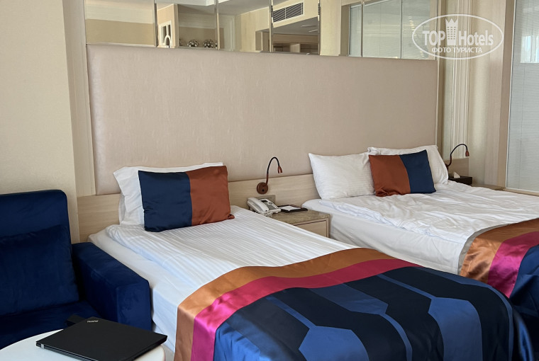 Только вернулись с отдыха, отдыхали с мужем и сыном 11 лет. Начну с того, что трансфер от и до аэропорта на минивэне, что очень комфортно. По приезду было немного непривычно без сопровождающего, нас довез водитель, дальше пошли сами на ресепшен, но в этом проблемы нет. Встретил нас русскоговорящий сотрудник Мурат, предложил 2 номера на выбор, на 2-м и на 3-м этаже. Мы выбрали на третьем и не ошиблись. Номер оказался очень просторный и свежий, все работало. В баре пиво, фанта, кола, спрайт, шоколадка и орешки, пополнялись ежедневно. В отель мы прибыли в 7 утра, заселили в 11. Сходили позавтракать и расположились в лобби на диванчиках. Персонал дружелюбный, в ресторане практически всегда подходили и спрашивали, не хотим ли мы что-нибудь выпить. Питание очень хорошее, очень качественные десерты, два раза были раки, но мы их не любим, через день мидии в панцирях, морские коктейли были каждый день, часто роллы ( но роллы так себе). Из мяса курица, говядина, свинина, иногда баранина, фрикадельки и что-то наподобие котлеток на гриле, рыба пару видов и иногда красную целиком выкладывали, куча всяких красивых закусок, овощей, фруктов не оч. много. Кофе в автоматах в ресторане на завтрак, обед и ужин, неплохой. Но очень вкусный можно взять в лобби. Алкоголь всякий разный, пиво бутылочное и на розлив. Очень вкусно можно пообедать в зоне бассейнов, там чего только нет, пицца, бургеры, курица наподобие KFC, гезлем, картошка фри, всякие кебабы… также соки, пиво, коктейли молочные и алкогольные. Бассейны выше всяких похвал, но к обеду возле основного большого очень сложно найти лежаки. Мы обычно приходили около 11 утра, находили, но чудом)) Жили в «спальном» корпусе, очень тихо и спокойно, только ночью был слышен храп из соседнего номера))) но не напрягало. А вот в корпусе возле всей развлекухи, наверное, шумно было бы. На море каждые 30 минут ходит автобус, полотенца выдают в обмен на карточки. Дорога минут 5 занимает, пляж оборудован от отеля. Читала в отзывах, что плохой, не соглашусь! Заход очень удобный, есть ресторан по меню, бар, лежаков много, найти можно спокойно. Камней в море нет, очень комфортно плавать. Вечером в 21:45 каждый день разные шоу, в 22:45 дискотека. Но дискотека, конечно, так себе)) 2 раза ходили ненадолго, для разнообразия. Примерно в 3-х км. от отеля, если идти прямо от шлагбаума, белек центр, там большой рынок с вещами, кафешки и очень симпатично вечером. Улицы горят огнями. Мы с мужем устраивали ежедневный променад, чтобы хоть как-то сжечь то, что наедали))) от этого не менее 15 тыс. шагов в день) Также недалеко от отеля есть остановка, где можно на автобусе доехать до ТЦ, мы ездили в Dipo, там есть фирменные стоковые магазины с хорошими скидками. В автобусе лучше платить лирами, первый раз оплатили долларами, нас на 2 доллара надули)) Такси в одну сторону выйдет около 50 долларов, это дорого. А на автобусе за троих около 7 долларов. Можно много писать про отель и сам отдых, однозначно рекомендую!