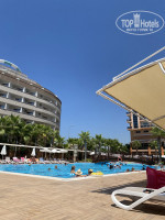 третий пункт я бы отдала в принципе территории отеля. в самом помещении есть бар и веранда, с которой открывается вид на бассейны. бассейнов в отеле три: один глубокий для взрослых, и два детских, у одного из которого есть горки, что весело как для детей, так и для взрослых. возле бассейна также есть бар, снек бар, где можно перекусить, взять мороженое. помимо этого, есть амфитеатр, где проводятся различные шоу - приезжают разные коллективы, начиная от танцевальных, заканчивая fire show. также здесь проводят дискотеки для маленьких гостей и лотерею бинго для взрослых.