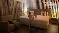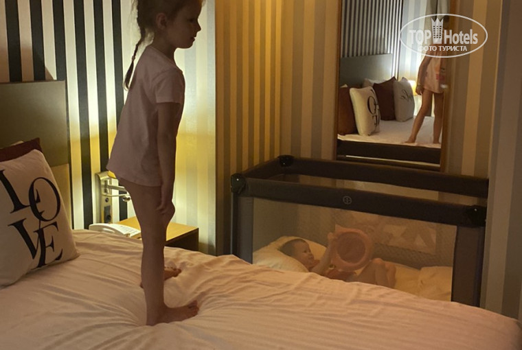 Однозначно рекомендую его и буду рекомендовать! Ездить думаю в дальнейшем только в этот отель! Территория отеля располагается вплоть до пляжа. Есть основное здание с номерами и есть домики. Не знаю как в основном отеле, но со слов соседей, которые отдыхали в отеле в основном здании-там номер был гораздо меньше, чем у нас в домике. Другие соседи были там второй год подряд и дважды отдыхали именно в домике. У нас номер был на третьем этаже-по стоимости при бронировании номера в основном здании и в домиках цены одинаковые. Домики расположены между основным зданием и аквапарками и луна-парком. В следующий раз буду бронировать на втором этаже, так как там есть дополнительная лестница к бассейну и окна понорамные с дверью купе. В нашем номере дверь на балкон была обычная маленькая и когда открывали окно для проветривания-штора собиралась и сильно светил свет с окна. Кондиционер был расположен прям над кроватью и дул туда же, что с детьми немного неудобно-мало ли их продует. Ночью было 24 и ветерок дул весьма хороший с улицы при открытой балконной двери, что и кондиционер был не нужен, однако утром и днем такой роскоши не было и спасались кондиционером хоть по немного. Днем была температура +36, ночью +24. Вода в море и бассейне весьма теплая и купаться можно было без проблем, море спокойное и чистое. Пляж песчано-галечный, причем сначала песок, потом почти у моря полоса Гальки, снова песок и при заходе в море Галька-иногда боялась поломать себе пальцы об нее, неприятно ногам было ходить по этим камням. Были небольшие плиты. По еде-есть ресторан в общем здании, есть ресторан у домиков, есть фуд корт возле большого бассейна рядом со сценой (даже ближе к амфитеатру)-с 12 часов начинает работать-есть бургеры, картошка, коробочки с лапшой, фрукты, напитки горячие/холодные, что то вроде шаурмы, салаты, мороженое в рожке либо в бумажном стаканчике, отдельно «палатка» с мороженным в пакетах -фирма со значком как инмарко, но на их лад; был ресторан на пляже. Есть дополнительно 5 ресторанов с разной кухней-при бронировании номера больше, чем на 5 ночей 1 ресторан на выбор бесплатное посещение, но бронировать его лучше прям сразу по приезду на ресепшен, так как народу много и все хотят туда попасть. На территории отеля аквапарк для детей -Пиратский остров, аквапарк для взрослых-горок 5-7 больших с плюшками, есть еще мини аквапарк у сцены -4 горки большие и 2 под навесом для детей. Все бассейны детские мы лично не посещали-подходили их посмотреть-весьма грязно было, так как с тем же бассейном у сцены есть рядом мини площадка детская и дети купались в бассейне, тут же бежали голыми ногами на площадку-а там черная земля весьма жирная и грязная и потом все грязные бежали обратно в бассейн-сами понимаете какая там была чистота после этого! Самый чистый был пиратский остров-аквапарк детский. Из больших бассейнов предпочтение лучше отдать бассейнам у домиков-там мало народу и соответственно меньше грязи. Вообще бассейны и территория отеля очень чисто выглядит, но я лично боюсь подцепить что то типа коксаки и слечь на весь отпуск блюя и понося из-за кого-то, кто не соблюдает гигиену и тащит свои микробы в общие бассейны. Есть также площадка детская на пляже. В номере мини бар бесплатный, также как сейф/фен. Мини бар:2 efes пива, 2 колы в ж/б, 2 спрайт в ж/б, 2 фпнты в ж/б, 2 газированные бут