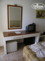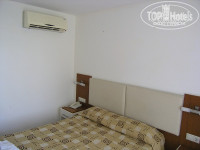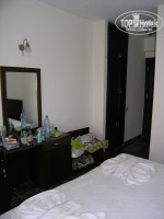 В номере были: 2 кровати (матрасы хорошие), телевизор с 1 каналом, очень небольшой шкаф на 6 вешалок, 2 ящика для одежды под телевизором, еле живой холодильник (его надо было подпирать, чтобы закрывался), небольшой сейф, который был отвинчен от шкафа и его можно было вынести из номера под мышкой (привинтили к шкафу сами), кондиционер прямо над кроватью (дует слишком сильно, слабо регулируется).