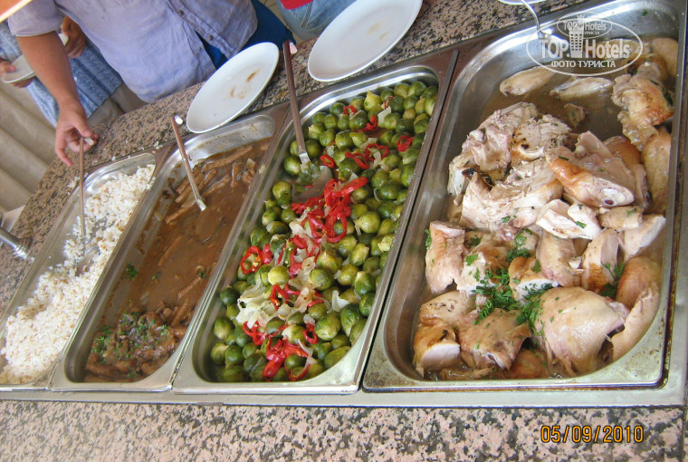 2. Про еду. Питание было на любой вкус – налопается и вегетарианец, и любитель поесть мяса. На завтрак – яйца двух видов, или омлет, или блинчики (а к ним 6 видов варенья, мед), сыр, очень вкусный компот из персиков, колбаса, хлеб, лаваш. На обед из горячего чаще было мясо, курица, рыба, печень, очень редко какие-либо сосиски. Разные гарниры (картофель, фасоль, макароны, цветная капуста, рис), много салатов и зелени. Были и супы, но я их не пробовала. Ужин почти так же как обед. В обед и ужин всегда фрукты (арбуз, дыня, яблоки, сливы, апельсины) и десерты (около 10 видов). Вся еда (горячее, гарниры, десерты) всегда есть в наличии, не надо бежать к началу завтрака, обеда или ужина. Напитки бесплатно – водка, раки, джин, пиво, минералка, газировка (все это в виде коктейлей или в чистом виде), пиво. Платно – другие коктейли. Есть кальян – платно.