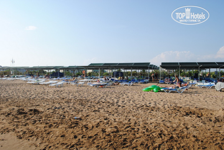 Теперь о пляже. Сам пляж песочный, лежаков много, не очень понравилось, что общий навес, как-то не комильфо. Будьте осторожны, при самом входе в море есть большие камни, есть только небольшой кусочек берега напротив вышки спасателей, где камней нет.