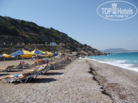 Море - Эгейское через дорогу, оно очень красивого голубого цвета и всегда волнистое, вход в воду - крупная галька, с детьми не рекомендую, можно также пройти по набережной до Средиземного моря с песчаным пляжем и прозрачной водой. Лежаки на пляже везде платно.