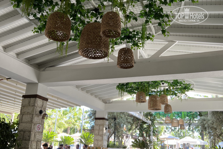 Есть Старбаркс,который находится в основном здании и туда совершенно не удобно каждый раз бегать с пляжа и обратно,вечно километровые очереди,работает одна сотрудница и график работы с 12-18. Но кофе вкусный.
