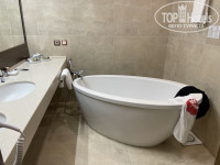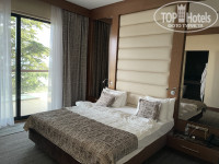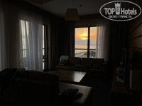 Номер очень просторный, представляет собой спальню, прихожую, гардеробную, два сан узла, общий холл с двумя диванами, телевизором, баром, панорамными окнами с прямым видом на море. Большой, опоясывающий весь номер, балкон с зоной отдыха.