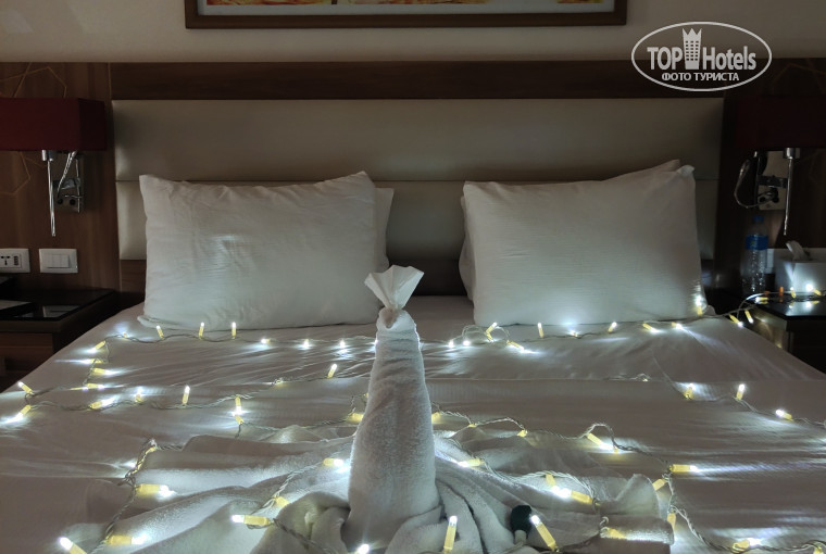 Отель понравился, очень хорошее обслуживание, сотрудники улыбчивы, доброжелательны, вообщем все классные ребята, особенно на лобби. Аквапарк огромный, горки для любого возраста. По питанию в целом все хорошо, много выбора мяса, много сладостей, фастфуд, мороженное. Алкоголь неплохой, пиво вкусное. Вообщем и в целом нам все понравилось, есть минусы, но для кого как .. Пляж далековат, рядом с нами жили шумные и неприятные итальянцы, вели себя непристойно мягко сказать, шоу неверленд нам не зашло, танцоры слабенькие, номера однообразные.. через 15 мин нам стало скучно, еще через 15 мин мы решили уйти. (А за это шоу отдельно от общей стоимости путевки турагент взял с нас 10 тыс, обязательный платеж, нельзя было отказаться). Недочеты по питанию: блинчики совсем невкусные, манго (хоть был и сезон) давали только один раз (за 8 дней). Аквапарк в аква блю, когда заходишь подниматься по лесенке на горки : там так себе запах (общественного туалета).