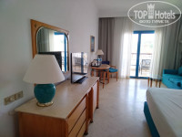 Мебель в номере, конечно, не новая. Но добротная. В прихожей в шкафу 8 вешалок, сейф, дополнительные подушки и одеяла. В санузле есть даже биде, просторная полка для умывальных принадлежностей и косметики, ванная с фиксированным душем, фен, розетка для бритвы. В комнате огромная кровать с очень хорошим матрасом (для больной спины - самое то). Полотенца менялись ежедневно. Несколько раз меняли постельное белье. Пляжные полотенца меняли по вечерам у парня, который убирал номера. К сожалению, другого способа смены полотенец не предусмотрено. В комнате несколько настольных ламп и торшер. Так что при отсутствии верхнего света - освещение нормальное. Телевизор - плазма (несколько русскоязычных каналов, но в основном - рекламные, кроме ТНТ). Электрический чайник, растворимый кофе, чай, сахар. Каждый день приносили по 1,5 литра воды на человека. Маленький, но довольно мощный холодильник. Просторный балкон. Но - проблема с сушкой полотенец и купальников. Приходилось их развешивать на балконных креслах. Уборка нормальная. Ну во всяком случае песка на полу не замечали.