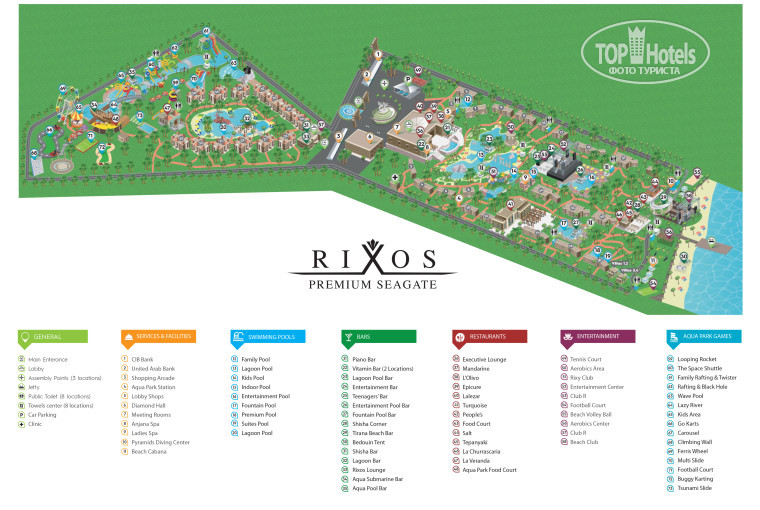 Территория отеля огромная и разделена дорогой на 2 части. На 2 линии номера новее и там же расположен аквапарк, но вся анимация на 1 линии. По территории постоянно курсируют миникары. У них разные маршруты. Один маршрут по кругу, по территории отеля (на 1 линии). Второй в аквапарк с заездом на территорию отеля (на 2 линии). Третий - по понтону, и четвертый в соседний риксос 18+. Машинок очень много, долго ждать не приходилось. Территория отеля очень красивая и зеленая. Кругом чистота и порядок. Много бассейнов разной глубины. Дневная анимация проходит только в одном бассейне. Около каждого бассейна дежурят спасатели.