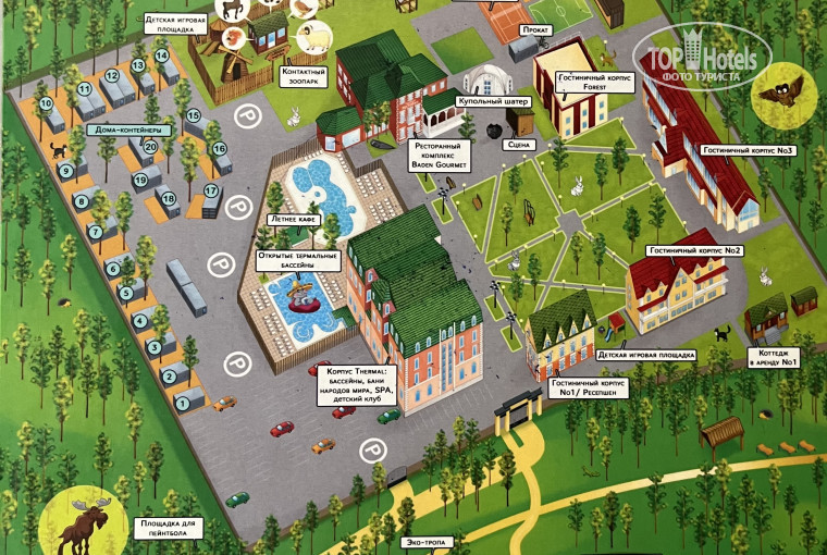 Парковка около ресепшен забита под завязку. Получилось припарковать, когда уехала машина с молодоженами пока были в очереди на оформление. Вторую машину удалось припарковать около контактного зоопарка (жили в корпусе Thermal, обходить далековато).