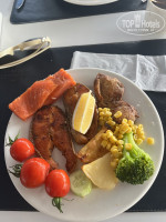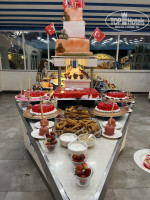 Питание очень хорошее . Из морепродуктов только рыба . Мяса много разного . На обед и ужин вкусный шашлык куриный и жареная форель больше всего понравилось ! Еда в основном ресторане ,в снегу -баре у бассейна (с 12 до 17 много еды и фруктов ) ,кофейня с хорошим кофе ,готовят турецкий кофе в турке тоже бесплатно . Кофейня с кондиционером и очень вай фай . На пляже тоже еда с 12 до 17 . Очень вкусные пиццы . Мороженое тоже весь день . Так же на пляже есть детский ресторан ,закрытый с кондиционером маленькими столиками ,всего по чуть чуть есть . А баре на пояде из алкоголя -вино и пиво .
