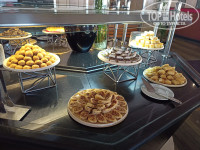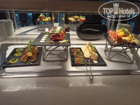 Не смотря на то, что отель был заполнен под завязку, и достаточно скромный по количеству посадочных мест основной ресторан очередей на раздаче практически не было, ну нельзя же назвать очередью двух-трех человек на гриль или за омлетом . Относительно ассортимента блюд он был более чем достаточным, конечно его нельзя сравнивать с Паломой, Нирваной, или Риксосом но выбор мяса, рыбы и морепродуктов был всегда. За время проживания практически через день готовились криветки на гриле, были осьминоги и кальмары, крабы и ракушки. Из мяса предлагали запеченную баранину и говядину, индейку и утку и конечно же курицу. Дважды в день менялась рыба. Не все из перечисленного конечно было на раздаче единовременно, но достойный выбор присутствовал всегда. Относительно сладкого нам показалось, что ассортимент расширился, появился чак-чак, больше стало козинаков, появились сладкие розетки, мороженное и тарталетки.