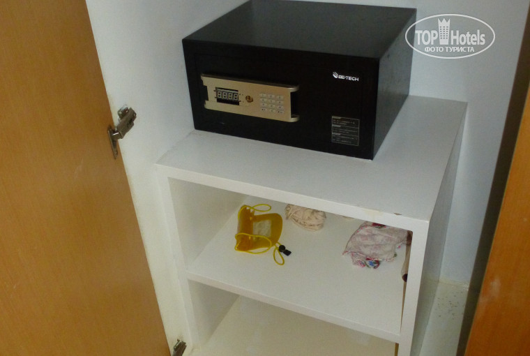 Есть 1 выдвижной небольшой ящик над холодильником и 2 открытые полки в шкафу под электронным сейфом. Вешалок в шкафу 6шт.
