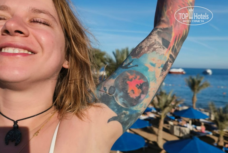 До пляжа 8-10 мин пешочком или можно уехать на автобусе. Шезлонги, зонтики все как положено. Снек бар и напитков.