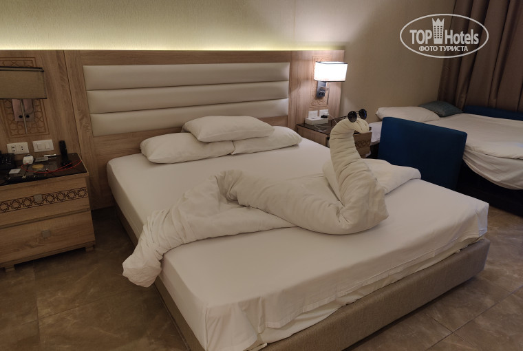 Хорошее место для отдыха с детьми. Тихо, спокойно, чисто, в то же время достаточно всяких движух и для детей , и для взрослых. В номерах чисто, аккуратно, по поводу уборки нареканий нет. Питание хорошее, разнообразное, отьелись разных рыбов, фруктов и овощей. На завтраки свежевыжатые соки. Вторая линия, до 5 минут ходьбы через дорогу или 3 минуты езды (гоняет маленький бусик регулярно, ждать практически не приходилось). Большая территория (совместная для 3-х отелей), куча горок в бассейнах - от маленьких для малышей, до средних для детей постарше и больших для подростков( там реально высота с 3-х этажный дом). Персонал ровный и отзывчивый, на все пожелания реагируют адекватно, на обедах, ужинах и в барах сами предлагают напитки и приносят к столикам. Вай фай на всей территории достаточно уверенный прием. За время отдыха несколько раз звонили с ресепшена и спрашивали про отдых, нет ли замечаний и проблемм. Анимация тоже понравилась, не напряжно, в то же время все легко и позитивно. Аниматоры и гиды открыты для общения, охотно делятся информацией не только об отеле, но и о городе. Где что лучше посмотреть, куда лучше съездить и где что сколько стоит. Куда можно сгонять, а куда не тратить время впустую. Однозначно рекомендую тем, кто ищет спокойный семейный отдых, а не "тагил"!