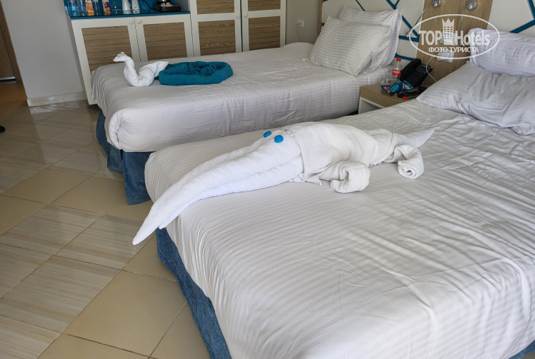 Разместили в хорошие номера с видом на море и бассейн . Номер свежий , полотенца , постель чистая ! Холодильник наполнен водой и коко Колой, есть электрический чайник , кофе чай сахар! Территория ухоженная и чистая, газоны постоянно подстригаются, очень красивый и удобный дизайн отеля, хорошие бассейны, их много, есть детский, небольшой аквапарк с водными горками, но мы правда не пользовались, вдоль береговой линии променад примерно на 3-4 км, вдоль отелей, брали электрокар за 20 долларов в час на 4 человека, пешком особенно не погулять, по берегу идёт застройка новых отелей, только по променаду