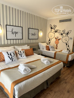 Номер как будто отремонтирован наполовину: одна сторона где кровати, полосатые обои и жирафы - ок, а напротив, где телевизор, зеркало, тумба, встроенный шкаф, и двери - как до ремонта, подвергались только реставрации чем-то белым тип герметика, это всё контрастно отличается и видно