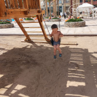 Пляж песок, чистый. Стоят мусорные вазы для разделения мусора, но мало кто читает🤦♀️. Лежаков достаточно. На пляже обитают вороны, но это не минус, по крайней мере для нас. Сын их подкармливал, расстреливал их водяного пистолета, бегал гонял, вобщем был активно занят, играл. Там, где заход в море с песка есть ограждение для детей (натянут канат с поплавками) и в конце бухты сетка от крупных рыб. Также можно спуститься в море по лестницам, по бокам берегов. Также на территории 2 бассейна, детский и взрослый. Детский почему то вообще ледяной. 4 раза ходила на ресепшн, просила включить, толку ноль. Тут же горки, не очень высокие и не крутые, можно с детьми кататься. На пляже есть красивая качель (для фото) и детский мини городок. Домик с горкой и качелями.