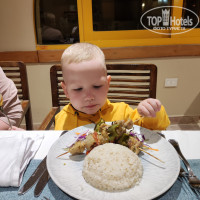 Еда на любой вкус: курица-тушеная, жареная; говядина; печенка с овощами (кстати вкусно очень) ; овощи (нарезка и для салата) ;зелень (рукола и кинза меня особенно порадовали) ;колбаса;сыр;картофель (фри, пюре, жареный, тушеный) ;макароны; пиццы;булочки ;яичница, оладья; для детей отдельный стол, там на завтрак хлопья или каша, обед суп и второе. Я не особо заглядывала, у меня ест с общего стола. Соки, вино и прочее как везде.