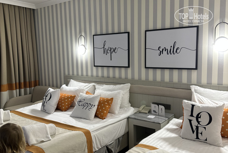Отдыхали в отеле с 12.05 по 19.05 с друзьями и детьми. Номера были оплачены с видом на море, вид шикарный и номер очень просторный с таким же балконом. При заселении не проверили кондиционер, как оказалось в этом отеле это первое, что нужно сделать при заселении. Естественно, он не работал вообще, и пообщавшись с многими посетителями здесь такое норма. В первый день приехали в сам отель около 21 часов вечера, хотя прилетели в аэропорт Анталии в 17:30. Тут конечно претензия к туроператору, а не к отелю, стояли в ожидании не понятно чего больше часа + остановка абсолютно не нужная, развод туристов в магазине.