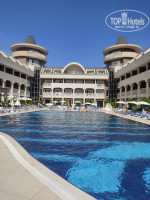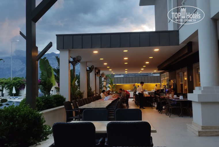 Отель больше городского типа, у него нет своей зеленой территории, он построен буквой П и между корпусами расположен открытый бассейн. Рядом с отелем центральная площадь и остановка с автобусами. Магазины, аптеки, клубы, все в шаговой доступности. В ресторане достаточно хорошо кормят, есть и мясо и зелень и разносолы, сыры, фрукты и сладости, есть снек бар, пляжный бар. Из напитков я брала белое вино и пиво. Еды и приборов всем хватало, официанты все время убираются и забирают пустую посуду со столов.