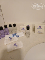 В номере было мыло, бутылочки с шампунем и кондиционером, одноразовые шапочки, тапочки, набор из ниток, иголка и пуговица.