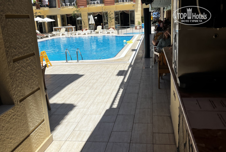 Отель подходит для отдыха парой, одному, компанией. Не очень подходит для отдыха с маленькими детьми. Анимации нет, возможно и стоило бы что то им придумать в этом плане, но как есть. Территория - это по сути небольшой внутренний дворик с неплохим бассейном и лежаками. Рядом же можно посидеть за бокалом пива, вина, коктейля и других напитков либо просто поесть. Как по мне, то пиво очень вкусное, джин тоже неплохой. Алкоголь только в отеле и с 10.30 до 22.30. На пляже только порошковые соки, вода и кофе разное с аппарата. Мороженое в отеле в баре с 12 до 17- по вкусу своеобразное, но в жару неплохо. Питание- очень все вкусно и на хороший уровень отеля 3-4*. Курица, рыба каждый день. Овощи, оливки, гарниры, сладости… Вечером повар каждый день что то готовил мясное на улице во дворике. Фруктов много- дыни, арбузы, персики, сливы, абрикосы, апельсины, один раз даже клубнику ели. Практически весь день можно что покушать в отеле.