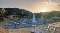 С одной из сторон речка, вход в воду галечный и очень резкий, отель типа ВИЛЛАДЖ, номерной фонд, старее, номера меньше, детского аквапарка нет, ну как сказать. Ничего из того что мы искали не попало.