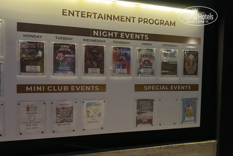 Анимация в отеле на момент нашего пребывания была скромной — всего три аниматора, поэтому было скучновато. Девочки-аниматоры старались, за что им большое спасибо. Вечерние шоу были простенькими, и очень не хватало живой музыки после шоу. Вся тусовка продолжалась в клубе на -1 этаже из-за жалоб жителей на шум. Клуб приятный и просторный, но хотелось бы всё-таки тусоваться на улице.