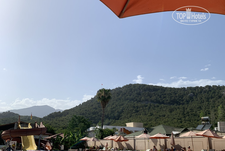 Большой бассейн, много шезлонгов, водные горки, бар у бассейна, днем лепешки от доброжелательной бабушки))))