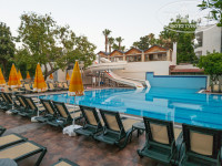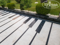 Размеры пляжа хорошие- но не просторные. Есть зонтики. Но тут как кому надо. Загорать или сидеть в тени. Тень нельзя угадать. Лежаки двигать некуда. В море большие и скользкие камни. Даже в "коралках" можно подвернуть ногу, если входить в море.Есть удобный пандус для входа в море и пластиковый понтон. Из моря не очень удобно на него подниматься. Есть кабины для переодевания, душ и краны для мытья тапочек. Есть хороший туалет. До него надо дойти-50 метров от пляжа. На задних рядах пляжа котики делают ямки и зарывают туда свои клады.