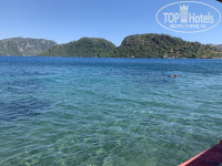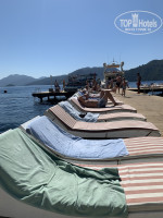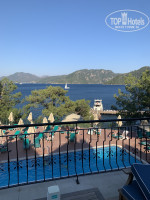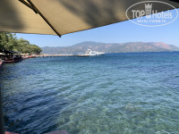 На данный момент нахожусь в отеле около недели. Полный восторг, красота вокруг необыкновенная! Вся территория утопает в зелени, чистейшее море, вид вокруг изумительный.. После 7 часовой задержки рейса, приехали около 8 утра. Нас отправили на завтрак, после чего выдали заполнить анкету, и очень быстро выдали ключ, не объяснив правда куда идти) Мы заказывали заранее вид на море, нас заселили в бунгало в первом ряду. По нашему номеру, вернее вида из него - также восторг! Всегда тень, до пляжа 50 метров. По номеру - санузел нет никаких претензий, все свежее, все работает, в самом номере мебель староватая. Но разве на это обращаешь внимание когда вокруг такая красота! По обслуживанию- все идеально, официанты носятся, моментально убирают грязную посуду, касается основного ресторана и всех баров. По самой кухне: на завтраки всегда одно и тоже - яйца, 2 вида омлета, соевые жареные сосиски и колбаски, оладья, картошка по деревенски, и куча сыров и зелени. В общем через 2 дня надоедает и мы не ходили) На обед и особенно ужин еда более разнообразная, конечно на свой вкус, но каждый для себя что-то найдет точно. В основном рыба, мясо - все вкусно. На набережной картофель фри и пицца (как по мне, не очень вкусная). Из фруктов арбузы, дыни и абрикосы.. Видимо особенность региона. Но у меня абсолютно нет претензий ни к чему. Убирают номера каждый день, если сами мешать не будете. По лежакам - проснулась рано, специально засекала время. В 7.00 большая часть лежаков свободна, начинается завтрак. В 7.43 при мне заняли последний, так что берите на заметку. Из развлечений - мы прошли в одну сторону до Ичмелера 1,5 км, и в другую до Мармарис 5 км. По набережной везде одно и тоже - набережные разных отелей, интересно посмотреть не по картинкам. По дороге в Мармарис можно сразу с набережной свернуть в центр города и самим пройтись по магазинам (покупать правда нечего особо, или подделки с больными ценами, или в Москве дешевле тоже самое).. Можно взять в прокат велосипед, можно заказать водное такси до Мармариса 200 лир с человека, есть обычная маршрутка 1 доллар. Я в Турции была в Сиде в основном, в отличных отелях, но такой восторг от красоты вокруг испытываю впервые, и сюда хочется вернуться повторно..