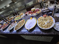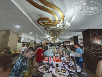 Мы приехали в разгар праздника Курбан-байрам. Заполненность отеля была на 100%, в отеле 2 корпуса примерно по 38 номеров, 5 этажей. Даже если по 2е живут это уже 760 человек. В отеле была вся 1000. Мы надеялись, что когда праздник пройдет, основная волна постояльцев спадет, а нет. Приехали новые. Отель максимально распродает спальные места. На ужине образовывались огромные очереди, люди ели стоя, мы даже стол как то сами убирали. С мясом огромные проблемы были все 2 недели. Курица да, была каждый день. пару раз были типа котлетки, которые жевать невозможно. Зато рыба, каждый день разный вид. Гарниры, сладости, овощи, все в достатке. Фрукты тоже разнообразные - арбуз, дыня, абрикосы, персики. В конце июня даже черешню дали и она оказалась вкуснее, чем в лавочках по дороге на базар. Вот эта фраза "голодными не останетесь" - да вы нигде не останетесь голодными, но из этого отеля лишних кг я не привезла.
