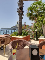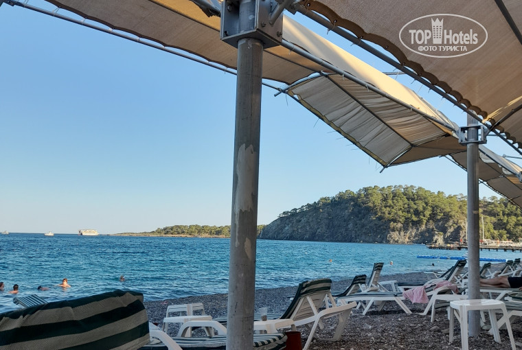Пляж. Рядом с отелем, из ресторана сразу спускаетесь и вуаля. Галька мелкая, вход также галька. Вход в воду недолгий, через метров восемь начинается серьёзная глубина. На берегу деревянный старенький пирс с шезлонгами. С него классно нырять. Вода прозрачная, шикарная, я с пирса несколько раз видела большие стаи больших рыб. Шезлонгов достаточно, всегда на всех хватало, старенькие, но не поломанные, а вот матрасы на них пора бы поменять, есть рваные. Рядом с шезлонгами столики. На берегу есть душ, душ для ног,