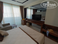 Доброго времени суток. Мы отдыхали в этом отеле с 29.06 по 07.07.2024г., приехали примерно 8 ч. утра. Заселили нас в 12ч., номер стандарт, какой и бронировали. Браслеты выдали сразу, поэтому позавтракали без проблем. Еда разнообразная, вкусная и свежая. Соки показались не насыщенными, как будто разбавлены водой. В баре огромное количество коктелей. Мороженого тоже предостаточно, ребенок тонну съел 😁. Сладостей очень много - тортики, пироженные, пахлава и тд. Есть тематические дни, в один из дней были роллы, не понравились, на вкус не очень. Уборка в номере и замена полотенец проводилась каждый день, замечаний нет. Большой бассейн, чистили его каждый день. Аква горки есть для совсем маленьких, и для детей постарше и взрослых. Горками также можно пользоваться у соседнего отеля Victory Be Mine. Лунапарк тоже отличный, достаточно аттракционов, в том числе и для маленьких и взрослых детей. Вечером анимация каждый день тематическое шоу, днём тоже активности проводятся различные игры. По субботам пенная дискотека. До пляжа есть трансфер каж. 3-5 минут, пешком около 10 мин. Пляж большой, лежаков предостаточно, вход в море пологий, местами встречаются камни но не критично. На пляже есть ресторан, небольшой компактный, еды достачно. В целом отель понравился, можно рекомендовать.