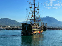 Удачное расположение,очень хорошее питание, номера так себе, заход в море - каменюки, Рядом большой Торговый центр Аланиум и разные магазины,мигрос....До пляжа 5-7 минут неспеша, мимо местного колорита.Рядом футбольное поле один раз приезжала какая то команда-народу много было.Через дорогу есть тунель ,лучше чрез него, потому что турки не любят пропускать пешеходов.На пляже лежаки и бар платный.Если в отеле берёте сейф на весь отдых, тогда лежак бесплатно.Свежевыжатый сок чуть дороже чем на Обе чуть по дороге назад от горы.Там тихая прогулочная дорожка.Круто гулять по ней когда начинаеться закат.Незабываемо,до мурашек.Деньги менял в Western Union , там и рули и доллары и лиры....,курс самый выгодный.На автобусе № 1 можно ездить на пляж Клеопатра и Телеферик (фуникулёр)-так дешевле чем на такси.Ездили на маршрутке на рыбный рынок(покупаешь рыбу и идёшь в кафешку с ней, отдаёшь её работникам) они тебе её жарят и приносят с овощами , оливковым маслом и соусом , с хлебом, и водичкой -на человека 60 лир было.Делают вкусно,быстро. И получается дешевле чем в кафе купить.Вобщем отдахнули неплохо.Если кому что то нужно ,- пишите, спрашивайте
