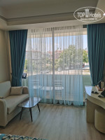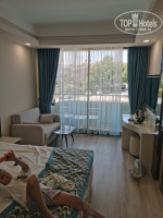 Заселили нас ровно в 14ч.Бронировали стандарт с балконом, дали на 5 этаже с видом на домики местных, вдалеке виднелись горы (обратите внимание, что в отеле есть номера с мансардным окном, категория Prom). Номер хороший, современный. Большая кровать с очень удобным матрасом и для ребенка был диванчик. Мини-бар пополняли ежедневно:вода, пепси, миринда и сок в коробках по 0,25. Несколько русских каналов. Большой шкаф. В ванной были все мыльные принадлежности,пополнялось все оперативно. В номере было тихо, спали хорошо. Даже не слышали соседей, шумоизоляция видимо хорошая . Кондиционер работал отлично. Сейф за доп.плату. Единственный момент, который мне не понравился - дали один ключ от номера, второй только под залог. Не знаю с какой целью это сделано, но такое встречаю впервые.Горничная убирала ежедневно, по уборке ничего плохого не могу сказать-всегда чистый пол, свежие полотенца. На балконе стандартно стол и 2 стула, вешалка для белья. Лифты приезжали оперативно. В коридорах было жарковато.