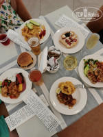 Обедали часто в ресторане на пляже. Это именно ресторан, а не просто снэк бар. Рыба, мясо, курица, картошка фри, пюре, рис, равиоли, макароны,пиццы,овощи,фрукты,салаты Можно было собрать самому шаурму или бургер(обычно чередовалось). В общем полноценный обед. В баре на пляже пиво, вино, шампанское.Холодильник с водой и айраном, палатка с мороженным. В баре на ресепшн и в баре у бассейна делали вкусные и очень инстаграмные коктейли. Мороженное с 13 до 21ч,с небольшим перерывом. Было и в упаковке(просто огромный ассортимент) и в стаканчиках/рожках. На пляже вкусные лепешки.У бассейнов тоже можно было неплохо пообедать. Следили за таймингом, через определенное время увозили еду, которая долго стояла на жаре и привозили свежую. В перерывах пекли вафли, пончики, всегда были фрукты. Очень классно, что на территории два отеля. Поскольку у каждого отеля есть как бы своя точка питания, которой можно пользоваться всем, не было очередей, всем всего хватало.