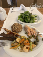 Еда. Меню разнообразное. Для детей отдельный стол с детским питанием в баночках и всем остальным.