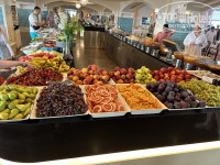 4. Основной ресторан - твердая 5. Все вкусное, свежее. Объедались клубникой, персиками, помидоры, руккола, пицца, торты. Вкусный чай, кофе - из кофемашины. Арбузы, дыни - на 3. Рыба- лещ, сибас, форель, семга , окунь морской - на 5. Королевские креветки - на 3, осьминог - как резина. Персонал - приветливая, шустрая, отзывчивая молодежь. Все понимают русский. На обед и ужин надо идти к открытию или закрытию - иначе места на воздухе, где +35С. Рядом полупустой ресторан ЛИРА, где выбор 30% от основного.