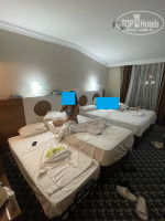 У нас было 2 взрослых и 2 немаленьких ребенка- 8 и 14 лет. Номер стандарт очень маленький для такого кол-ва людей. Тут конечно мы сами виноваты что не бронировали фэмили, ведь стандарт рассчитан на 3 человека. Нам принесли раскладушку (кстати удобную) и места для прохода между кроватями уже не осталось. В номере чисто, относительно не старое, в хорошем состоянии, окна современные в пол, единственное - ковролин не симпатичный и местами уже в несмываемых пятнах. Постельное меняли 1 раз, и +1 раз на одной кровати где пролился сок в этот же день снова поменяли.