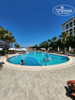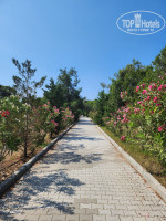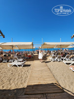 Пляж: Идти до пляжа мин 5-7 по красивой, зелёной аллее. Но около отеля дорога, нужно через нее перейти и по аллейке к морю. Нам это было на руку, так как хотелось ходить после такого количества съеденного и выпитого))) Море отличное, пляж отличный - песок, при входе небольшие камушки, в моменте было не очень приятно заходить и выходить. Брала с собой коралки, не понадобились. Приходили мы на пляж в районе 09.30, лежаки находили всегда свободные. Гуляли по пляжу и в одну сторону и в другую. Ещё нам рассказывали, что если пойти от пляжа налево и пройти км 4 или 5, то можно дойти до косы, мы не пошли, далеко)))